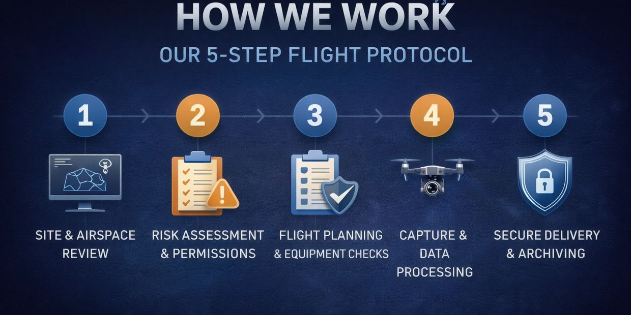 Post-flight, all captured data undergoes structured processing, quality control review, and secure digital handling. Deliverables are formatted to client requirements and transmitted via secure file transfer methods. Project data is archived in accordance with UK data protection obligations and retained only as necessary to fulfil contractual or legal responsibilities.
